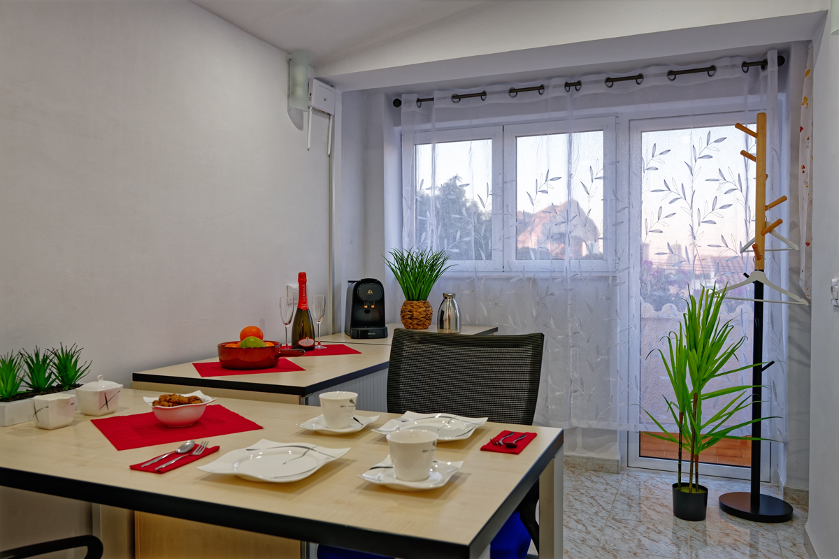 Es gibt außen am Balkon und auch innen je einen Tisch mit 2 Stühlen, sowie Ablageflächen für den Reisekoffer.